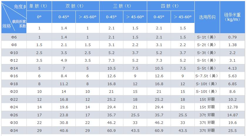 鏈條索具在使用時盡量使用 β 角≤ 45°,如果未說明就默認(rèn)為該角度。β 角為鏈肢與鉛垂線的夾角。
